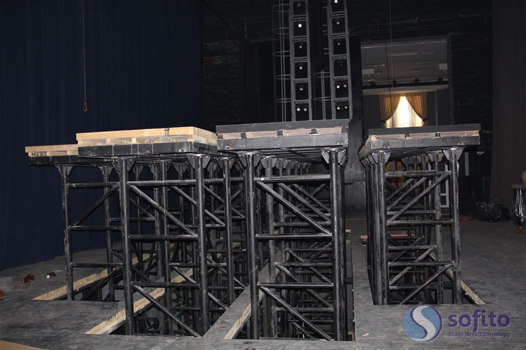 This is a mechanical system placed on the centerline of theater stages with diameters from 8 to 15 m which may rotate clockwise or anti-clockwise on the stage. It also enables to install various scenery sets simultaneously and to provide the audience the required scenery to be viewed. It also includes the technology which makes the theater reach the cinematic speed using it for making the motions such as walking and running in a play to be viewed stationary on the same location by the audience.